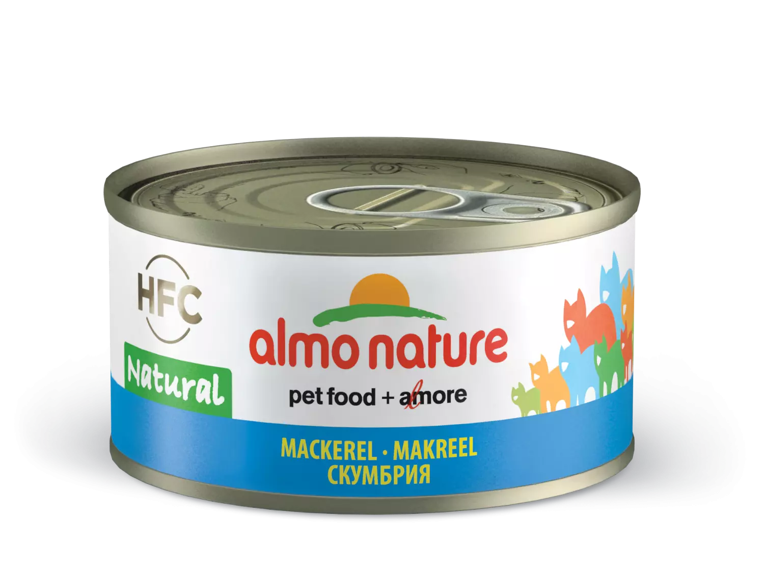 Tilleggsfôr til katt i gele. Kjøttet og fisken som brukes i Almo Nature HFC, er 100 % HFC – dvs. opprinnelig egnet til menneskelig konsum og som nå brukes i mat til dyret ditt. Almo bruker 100 % av fortjenesten som genereres av salget av produktene sine til å beskytte katter, hunder og biologisk mangfold gjennom Fondazione Capellino sine prosjekter. Sammensetning: makrell 55 %, fiskebuljong 44 %, ris 1 %. Næringsinnhold: råprotein 10,9 %, råfiber 0,1 %, råfett 4,2 %, råaske 0,9 %, fuktighet 82,3 %.