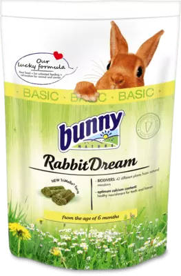 Bunny Nature Rabbit Dream Basic er et komplett og naturlig dyrefôr for kaniner fra 6 måneders alder. Denne naturlige, fiberrike maten (råfiber: 21%) er laget med 42 forskjellige gress og planter fra permanente enger. Det optimale kalsiuminnholdet i disse pellets bidrar til å opprettholde sunne tenner og bein. Pellets har et optimalt forhold mellom råfiber og stivelse (3,5: 1) for å forhindre fetning.