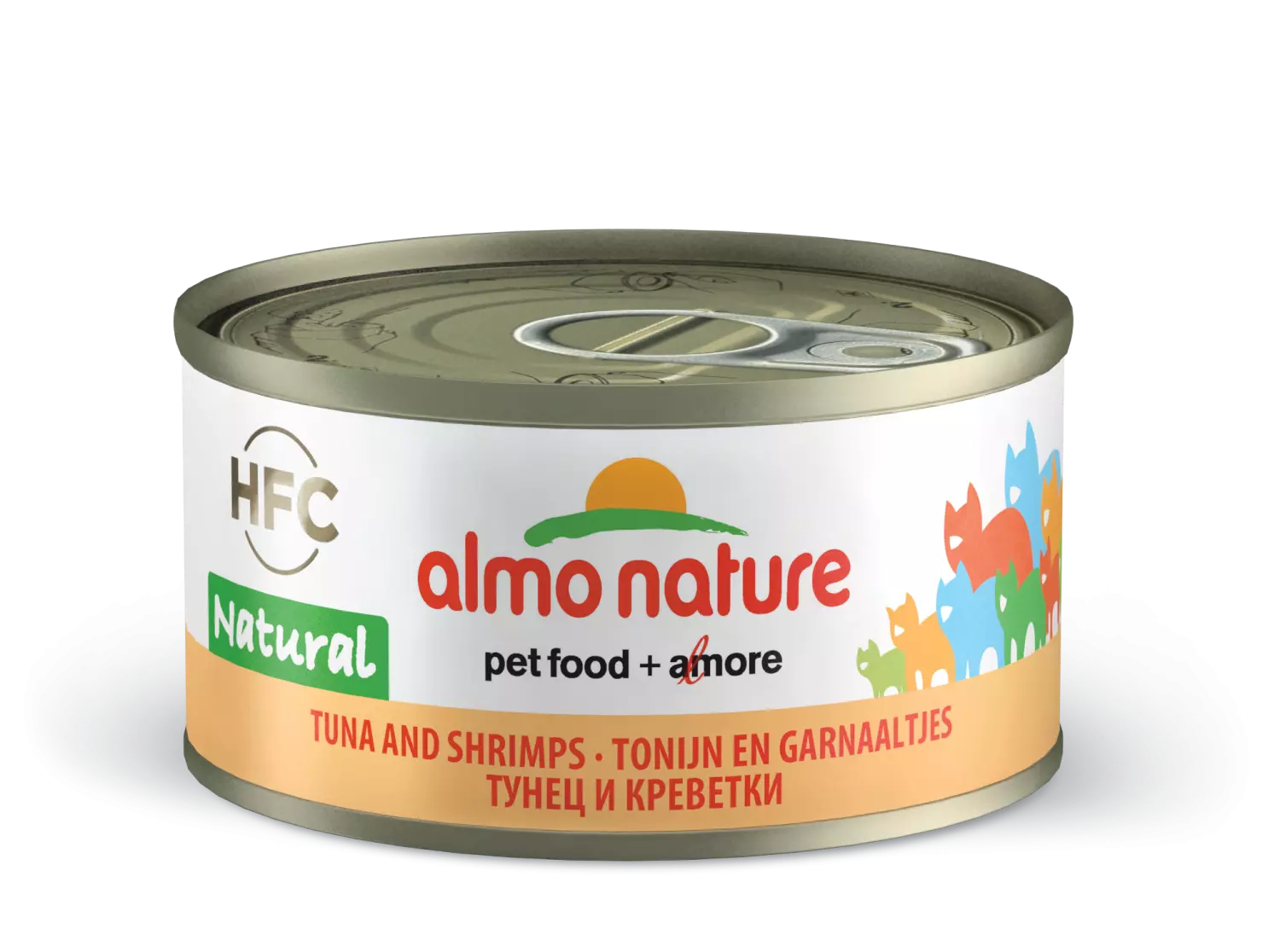 Tilleggsfôr til katt. Kjøttet og fisken som brukes i Almo Nature HFC, er 100 % HFC – dvs. opprinnelig egnet til menneskelig konsum og som nå brukes i mat til dyret ditt. Almo bruker 100 % av fortjenesten som genereres av salget av produktene sine til å beskytte katter, hunder og biologisk mangfold gjennom Fondazione Capellino sine prosjekter. Sammensetning: tunfisk 55 %, fiskebuljong 24 %, reker 20 %, ris 1 %. Næringsinnhold: råprotein 19 %, råfiber 0,1 %, råfett 0,5 %, råaske 1 %, fuktighet 77 %.